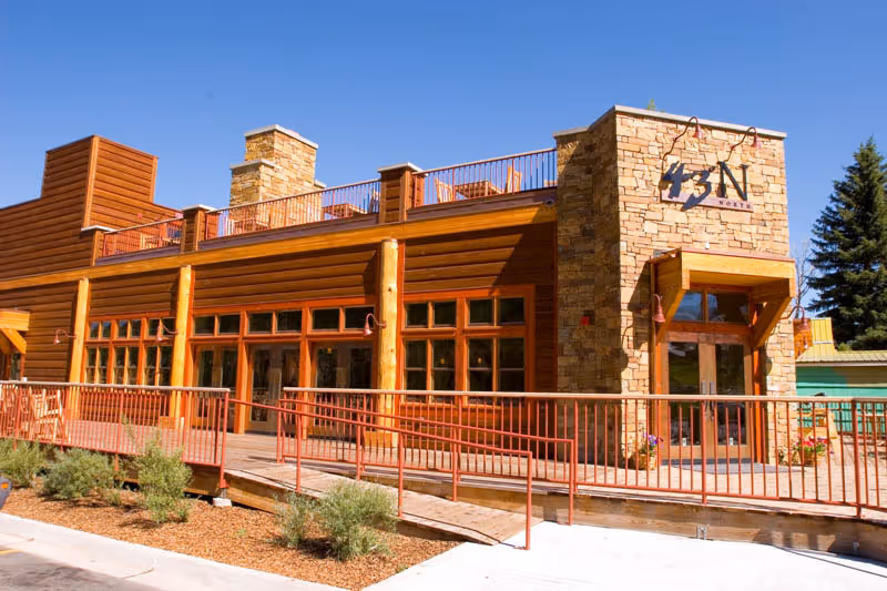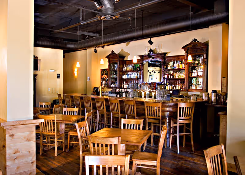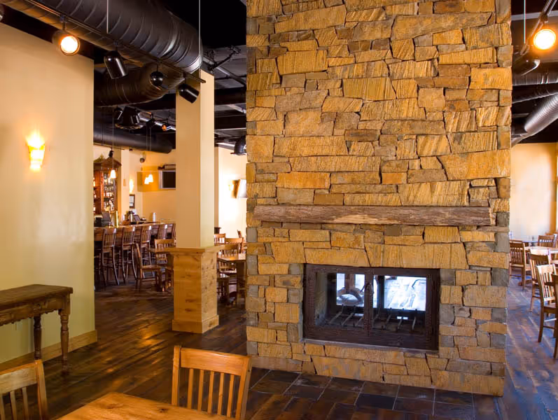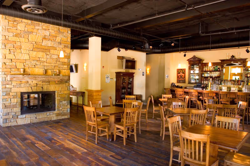 This Eliot Goss designed building has a full service pub and restaurant with roof deck, pass through fireplaces, reclaimed flooring and antique bar engineered and constructed for future vertical expansion.