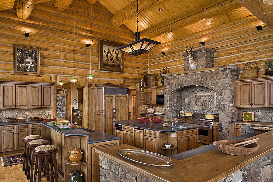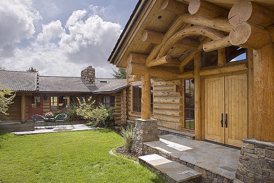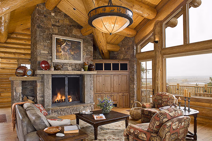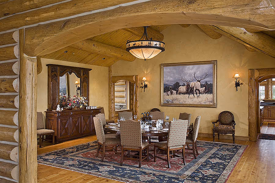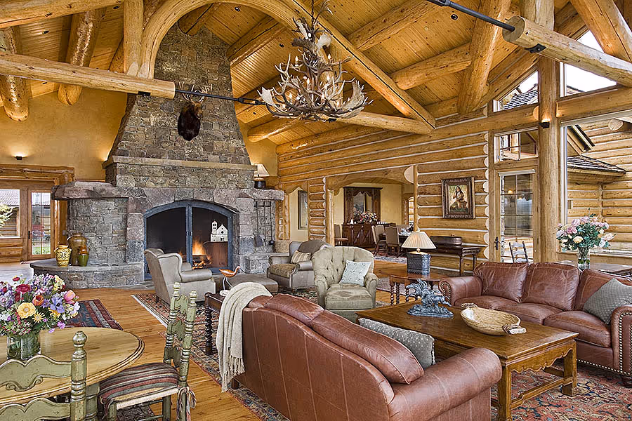 This spectacular home, designed by Ellis Nunn & Associates, features full-arch barrel trusses as the signature element. Elegant log and stonework create a distinctive and sophisticated residence with classic Western charm. Expansive windows that frame the property’s multiple natural water features provide ample natural light, and blend the sweeping Wyoming landscape with the openness of the home’s interior.