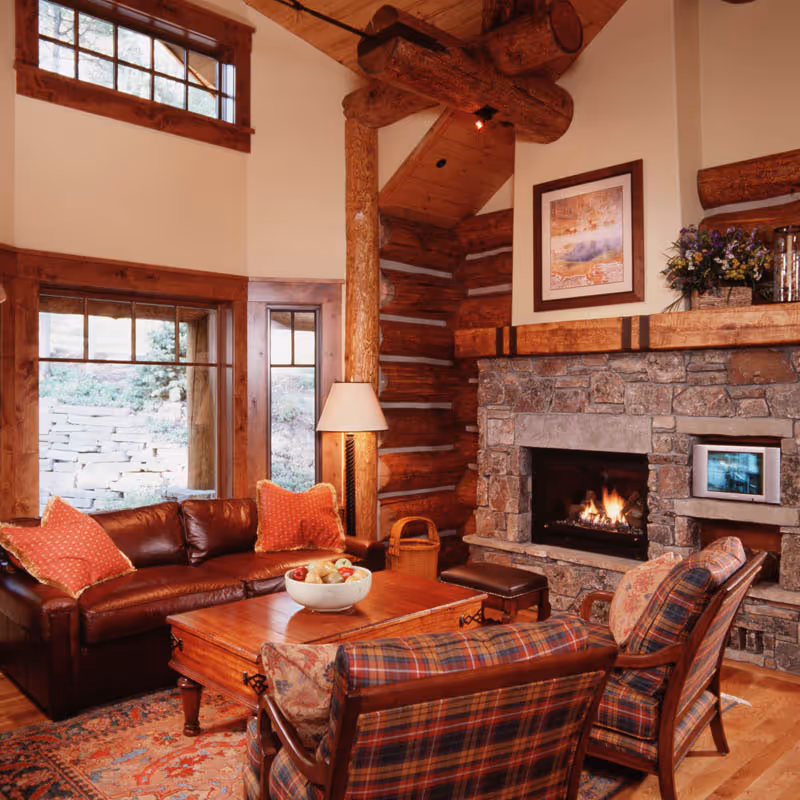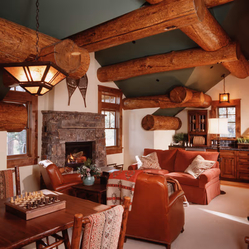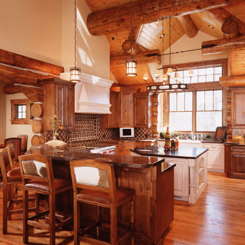 An elegant, unique hybrid cabin blends steel, stone, log and conventional framing to create a sophisticated Western feel. Inspired by the mountains and forests that surround it, this home combines quintessential elements of the mountain palette to create a spacious sense of comfort and luxury. With beautiful, handcrafted details and finishes, this spectacular home nestled into the mountainside is the perfect retreat after a day of alpine adventure. The Granite Ridge Log Cabin was featured on the cover of Log & Timber Style, as well as in Log Homes Illustrated.
