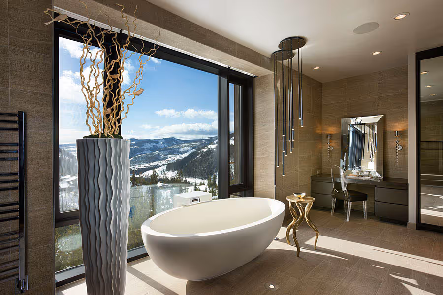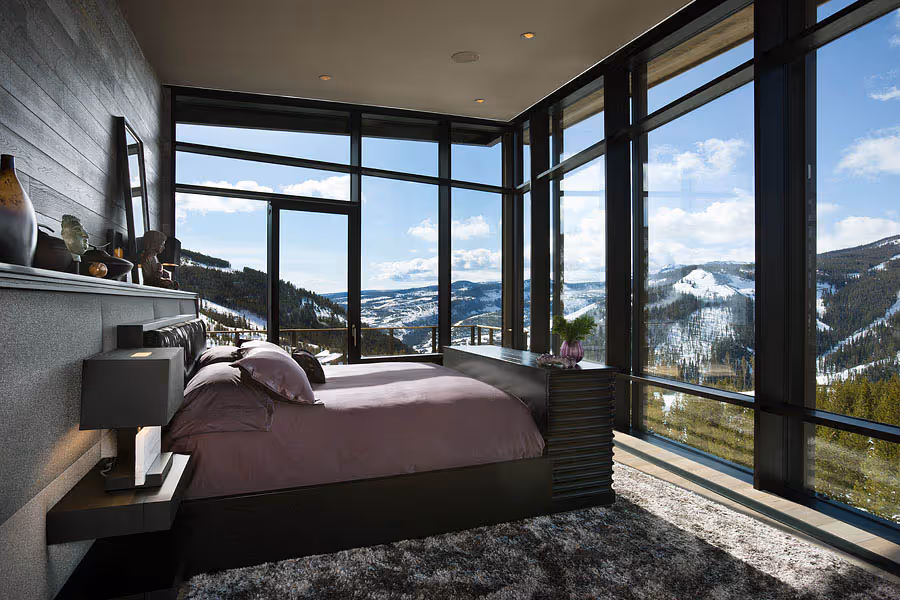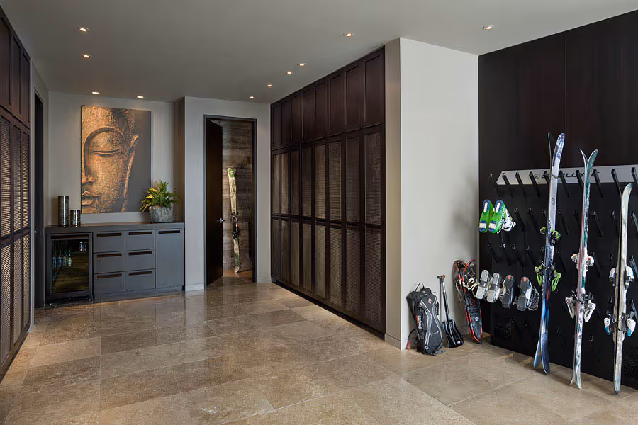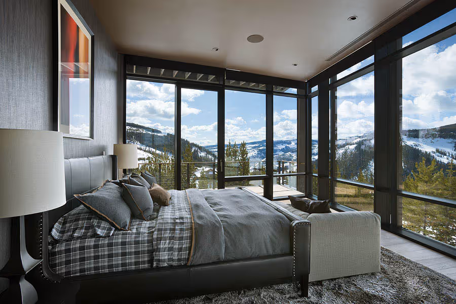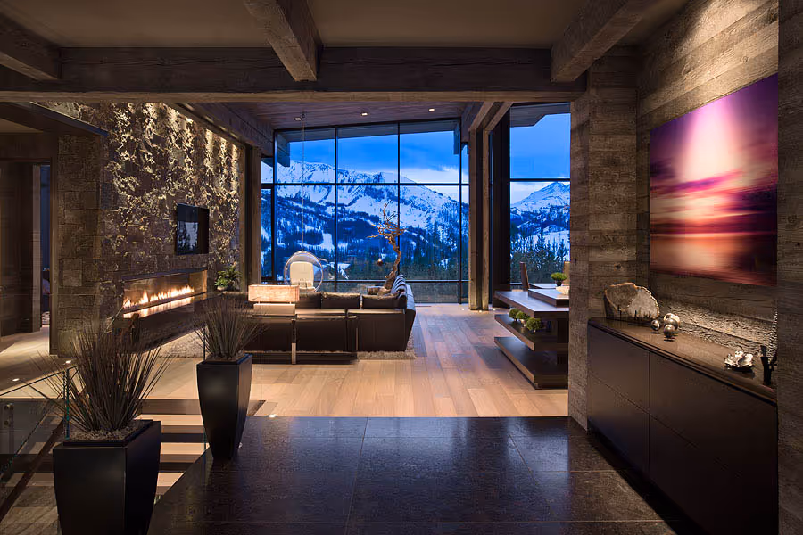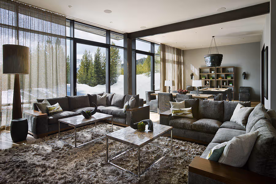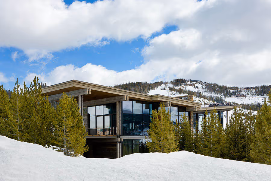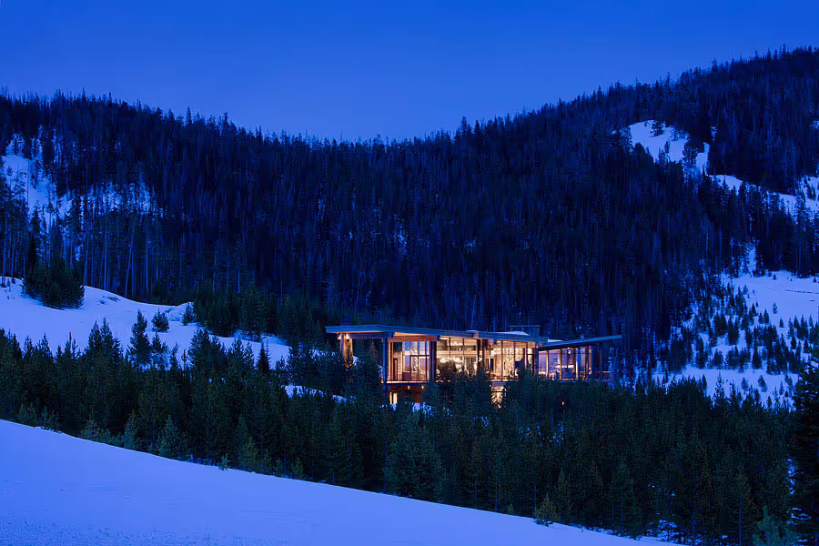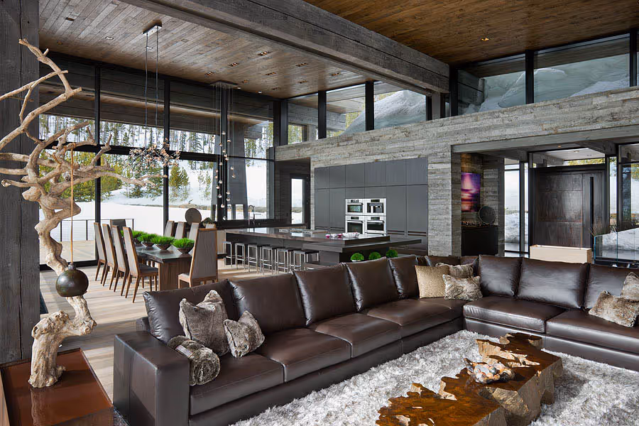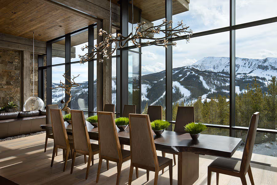 A spectacular modern home, the Lower Foxtail Residence seamlessly infuses classic western elements into a clean contemporary design. Expansive windows and bold lines compliment textures inspired by a Western palette; stonework, warm wood paneling and plenty of natural light combine to create a uniquely elegant mountain ambiance. Tucked in among a multitude of traditional log cabins in the Yellowstone Club, this design by Reid Smith Architects and chic interiors by LC2 Design Services, this home stands out for not only its impressive energy efficiency, but also its sophisticated beauty.