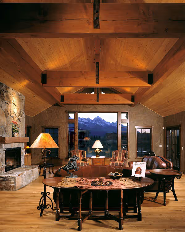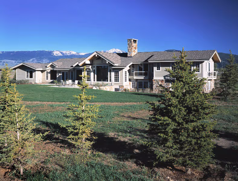 With breathtaking Teton vistas, this custom ranch house was designed by Eliot Goss. Wood and stone finishes give this beautiful residence a contemporary and warm ambiance. This sophisticated and distinctive residence combines classic luxury with a flair of Western charm.