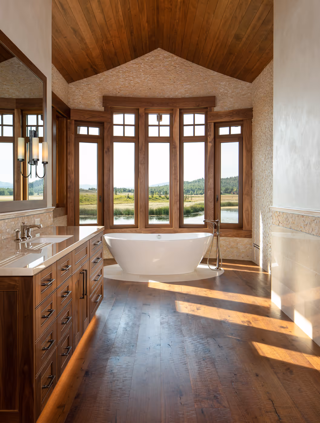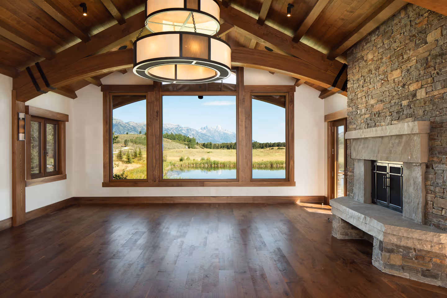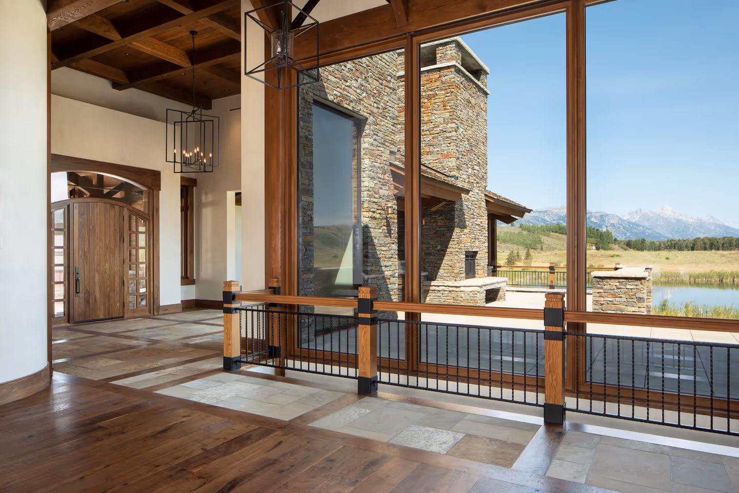 Nestled in the heart of Jackson Hole's breathtaking natural landscape, this stunning home seamlessly blends into its expansive conservation parcel surroundings. Every detail was carefully crafted to create a warm and inviting living environment, complete with luxurious amenities such as a library, a grotto, wine storage and tasting room, and lightwells. The home also boasts at-grade access to lower floor rooms, and strategically placed earthen berms to preserve the stunning panoramic views. Originally designed by Strout Architects and completed by Studio 307 Architects, this home showcases a beautiful blend of large format glass, rich walnut and stone materials, and a central fireplace accessible from all four sides. Additionally, the home incorporates an innovative energy recovery system that utilizes a man-made water body as a heat sink and source, further highlighting the home's commitment to sustainability and energy efficiency.