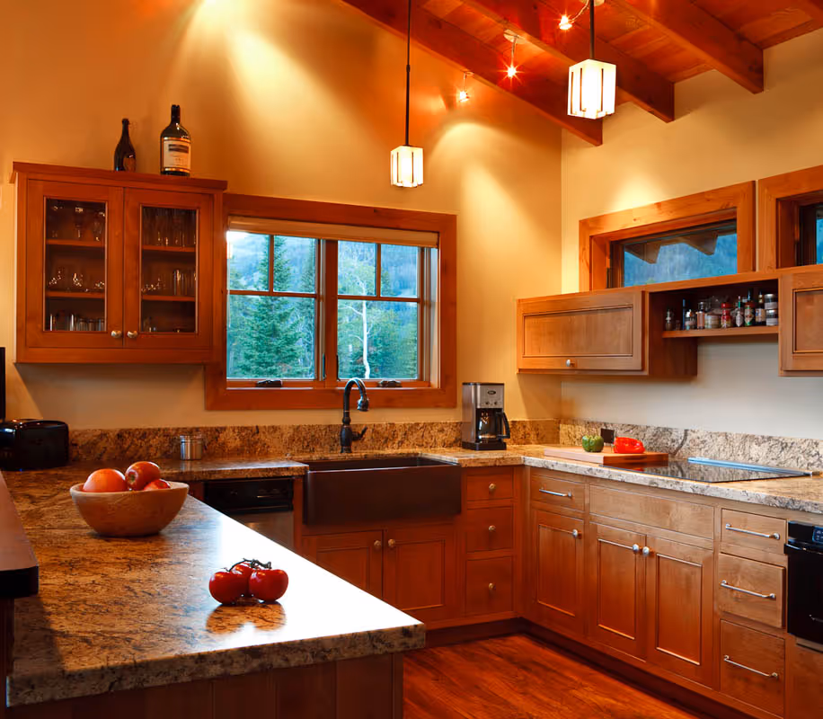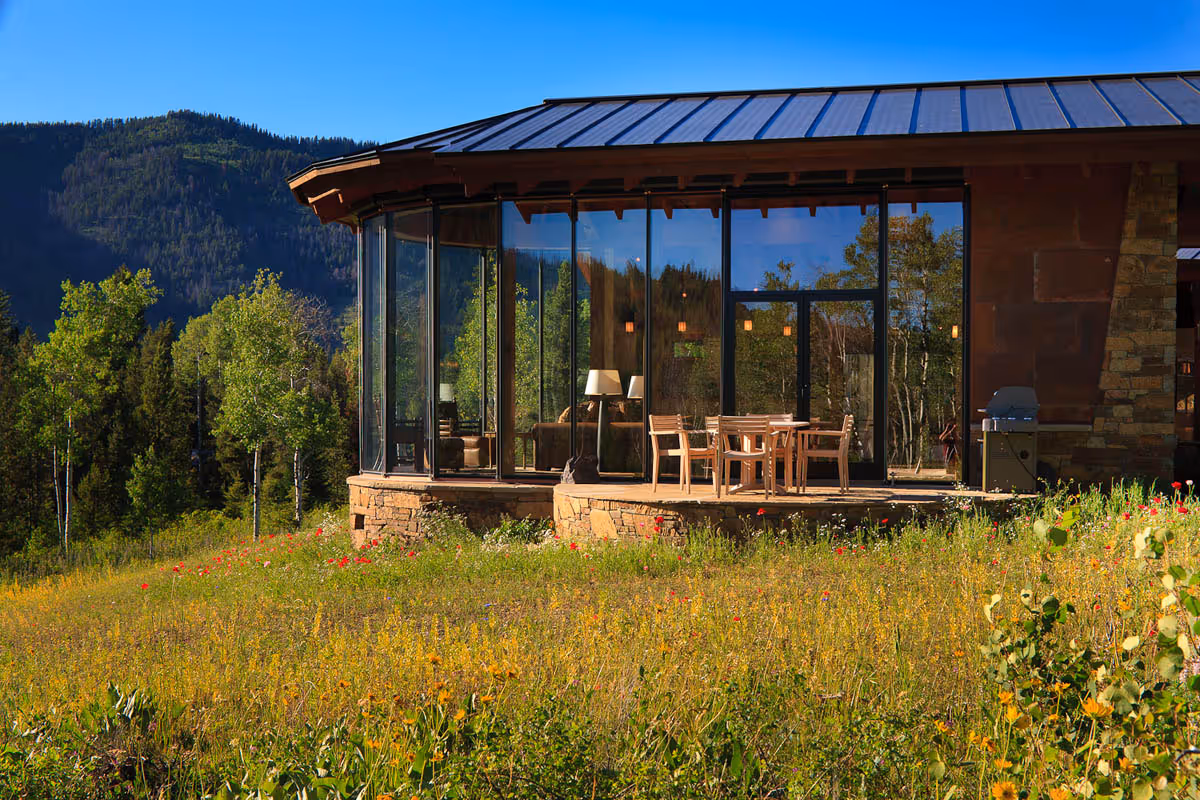 Expansive windows sweep up to the clean lines of heavy timber frame in this distinctive home in Wilson, Wyoming. Designed by Strout Architects, this truly unique residence is centered around the unobstructed views of the surrounding forest, hills and mountains beyond. Featured in Homestead, this home represents an artful blend of rustic elements and a fresh, contemporary flair.