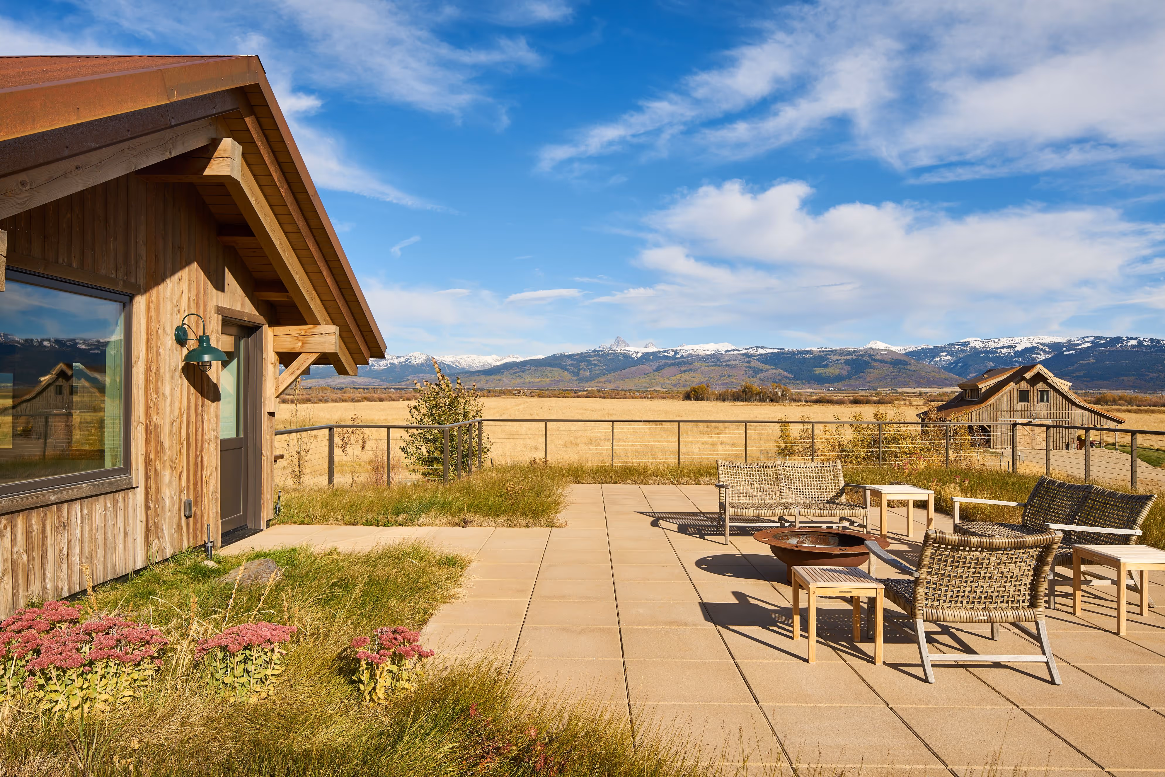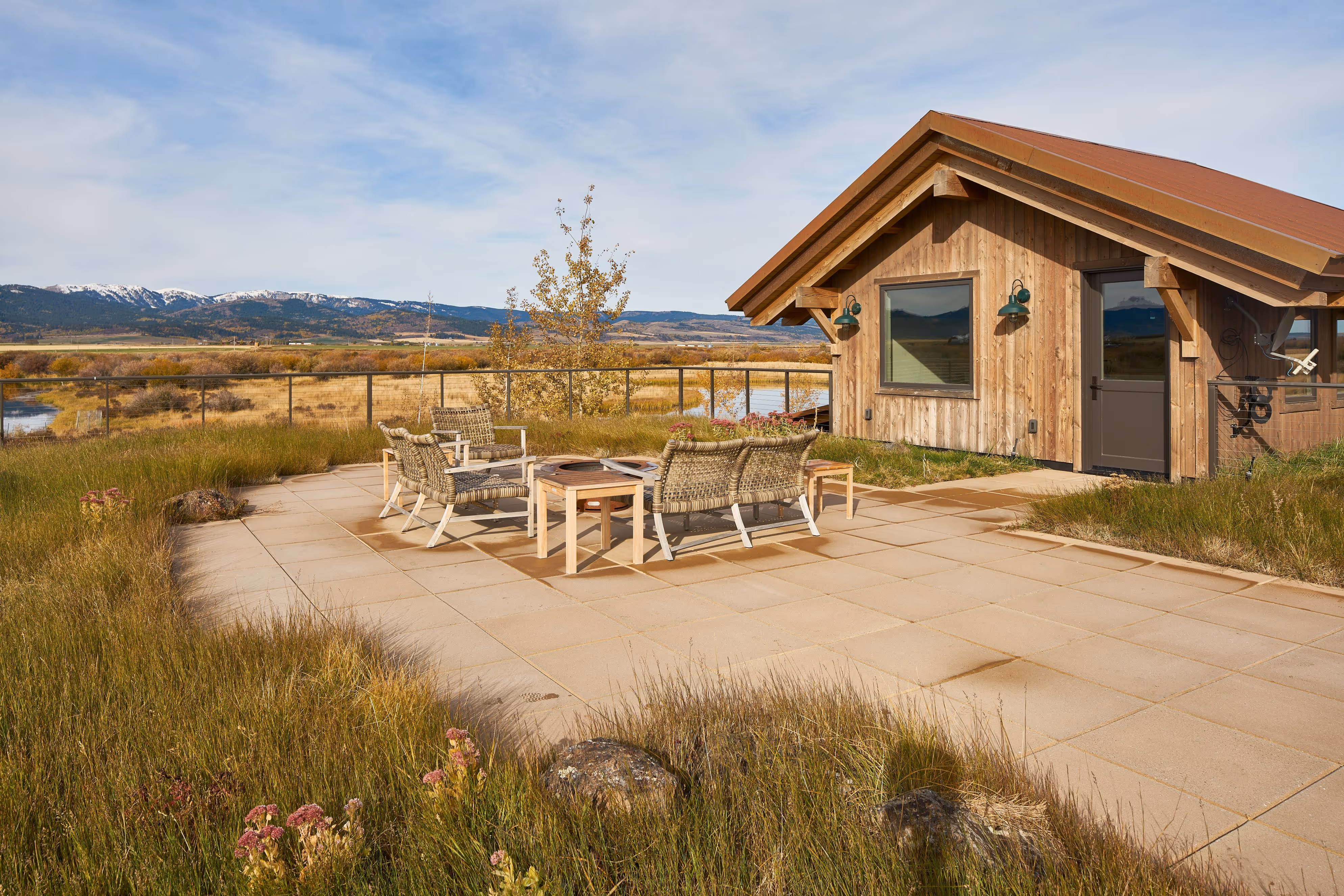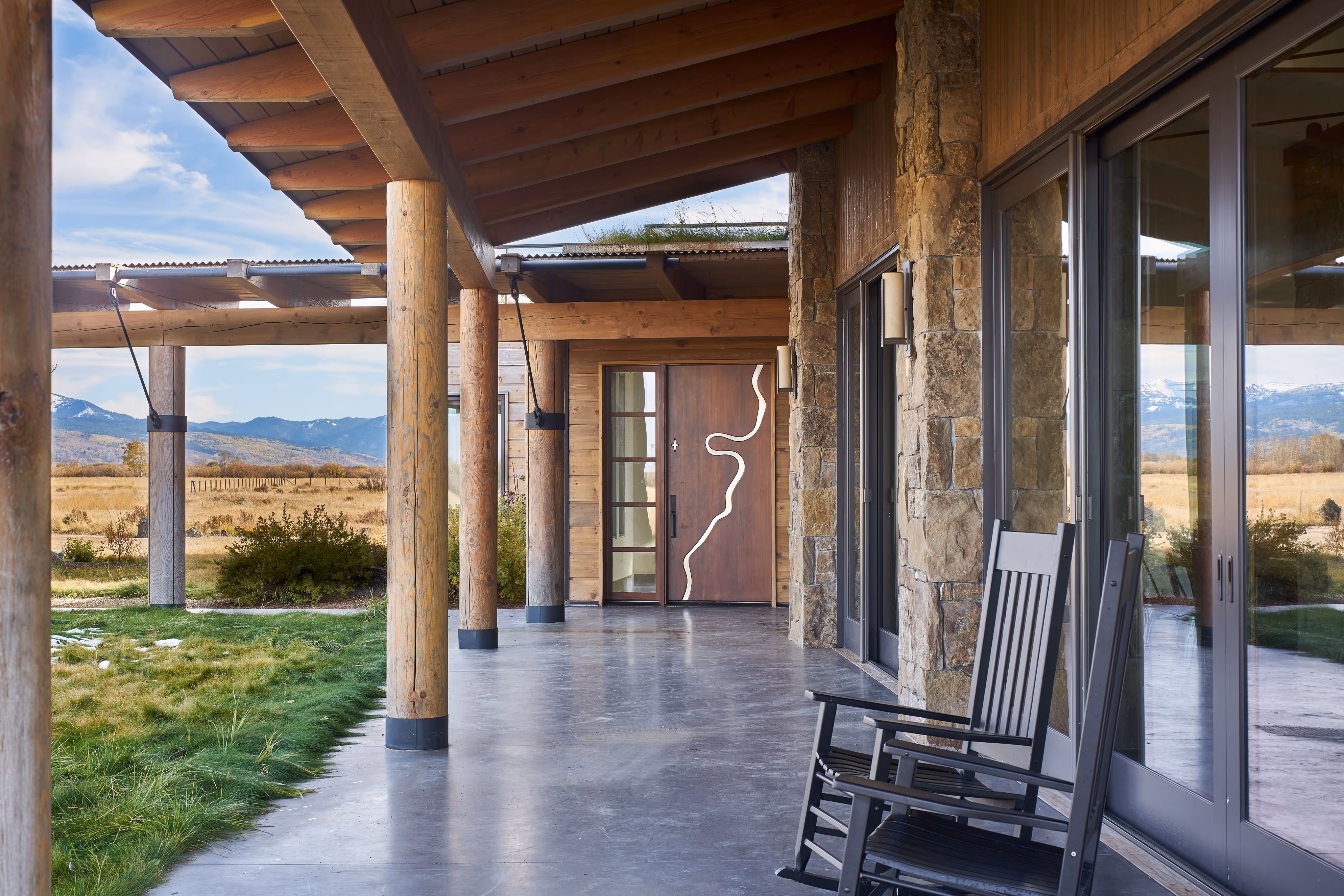 This home built in Driggs, ID captures the wide open spaces around it through ample glass and strategic orientation of the home. Located along the Teton River corridor this home was designed by Strout Architects to feel connected to its surroundings. The home features a partial sod roof; oxidized Corten roofing; and a front door with the eponymous Rainbow Bend embossed in metal. A two story structure, this home feels settled into the earth. Being surrounded by grasslands, the color palate was critical in achieving the illusion of a small cabin on the water.