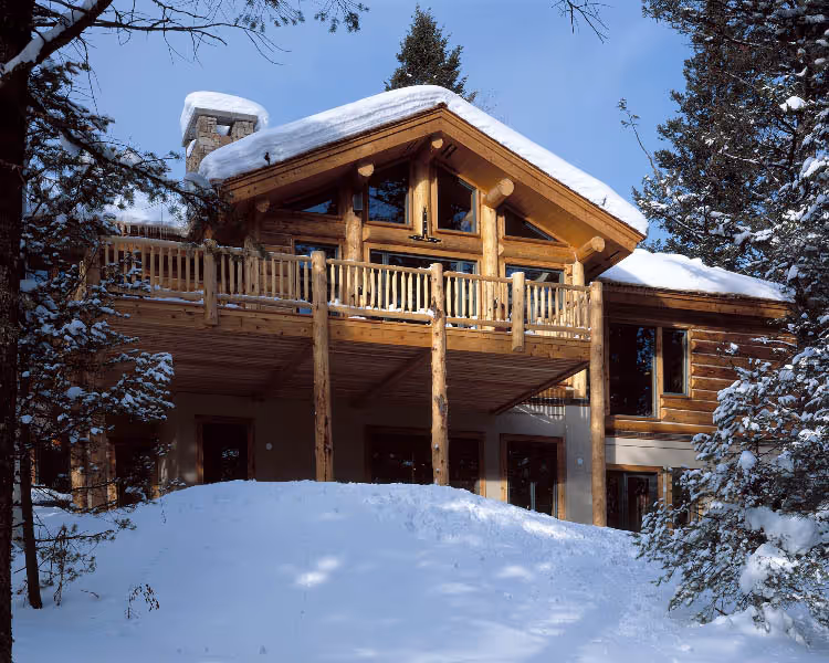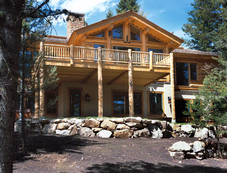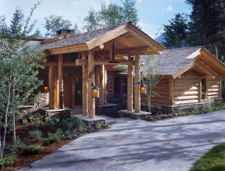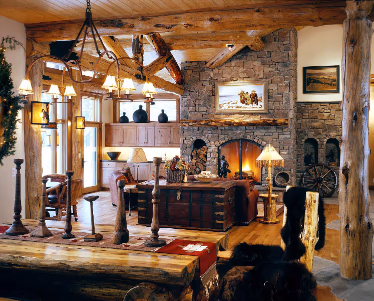 This custom home, designed by Eliot Goss, is a unique combination of conventional framing with log post, beam and truss roof structure. The refined, rustic ambiance of the home is enhanced with custom, handcrafted details by Trauner Designs. Elements of stone, metal and wood blend in this sophisticated and elegant home. With a timeless and chic character, this Jackson Hole cabin is featured in Ralph Kylloe’s “Cabins & Camps.”
